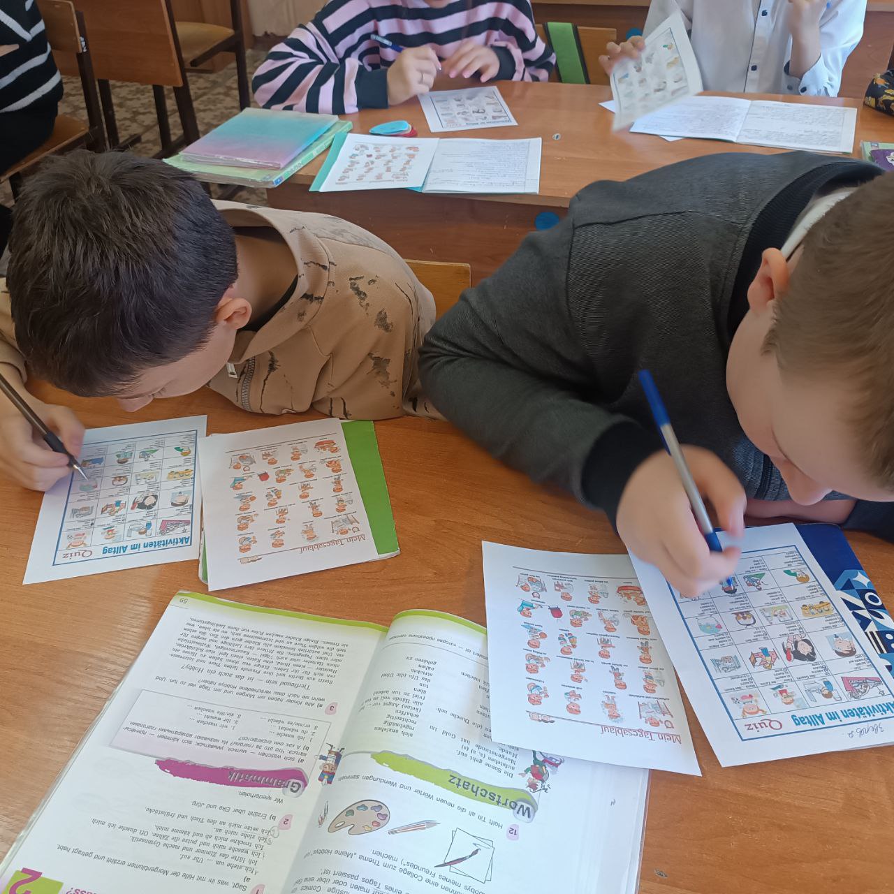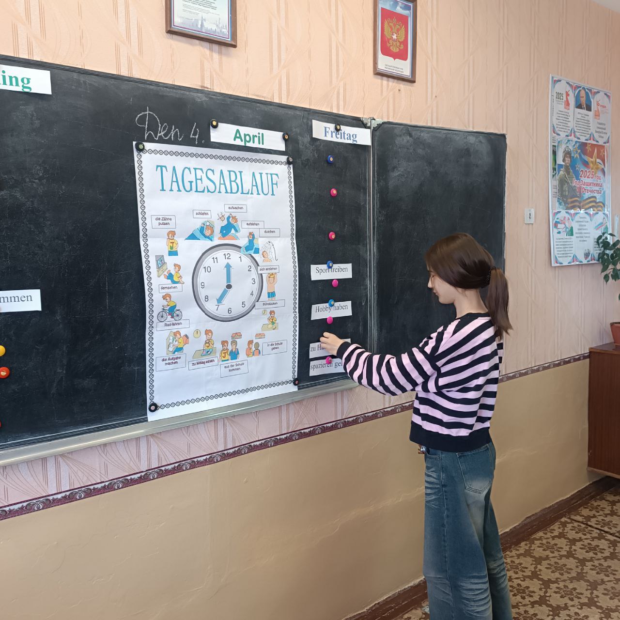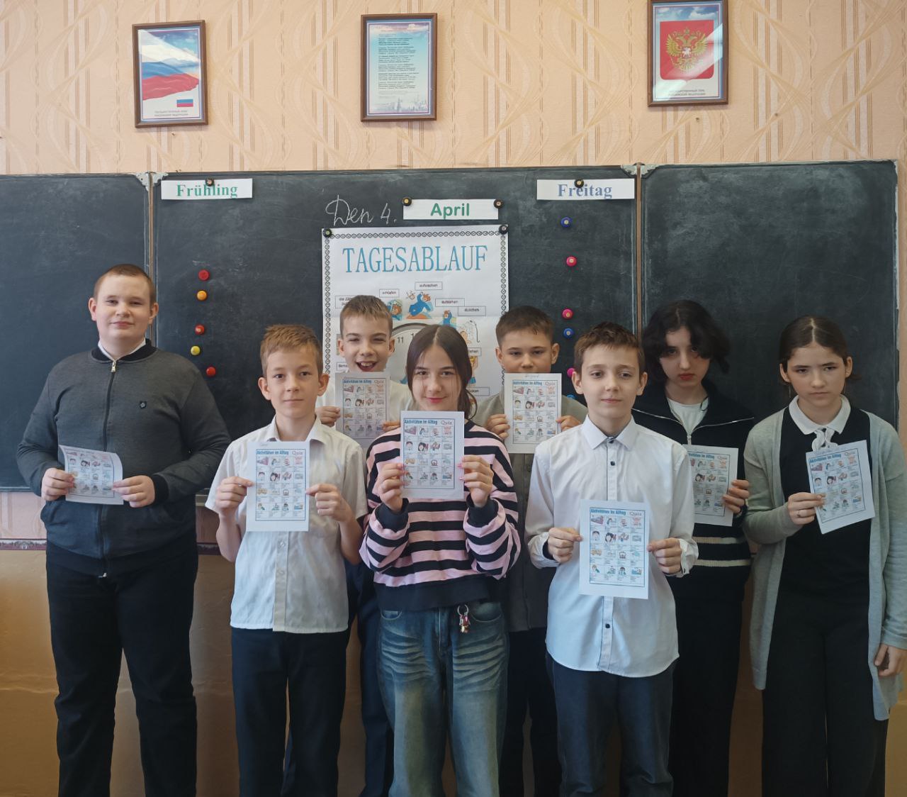 4 апреля в 6х класса в рамках декады филологии прошёл урок немецкого языка на тему "Режим дня". Учащиеся тренировались в игровой форме употреблять слова и словосочетания по данной теме, учились строить предложения о занятиях детей в течение дня. В конце урока всем было предложено решить занимательный тест в картинках. Результаты теста показали, что большая часть учащихся хорошо усвоила данную тему.