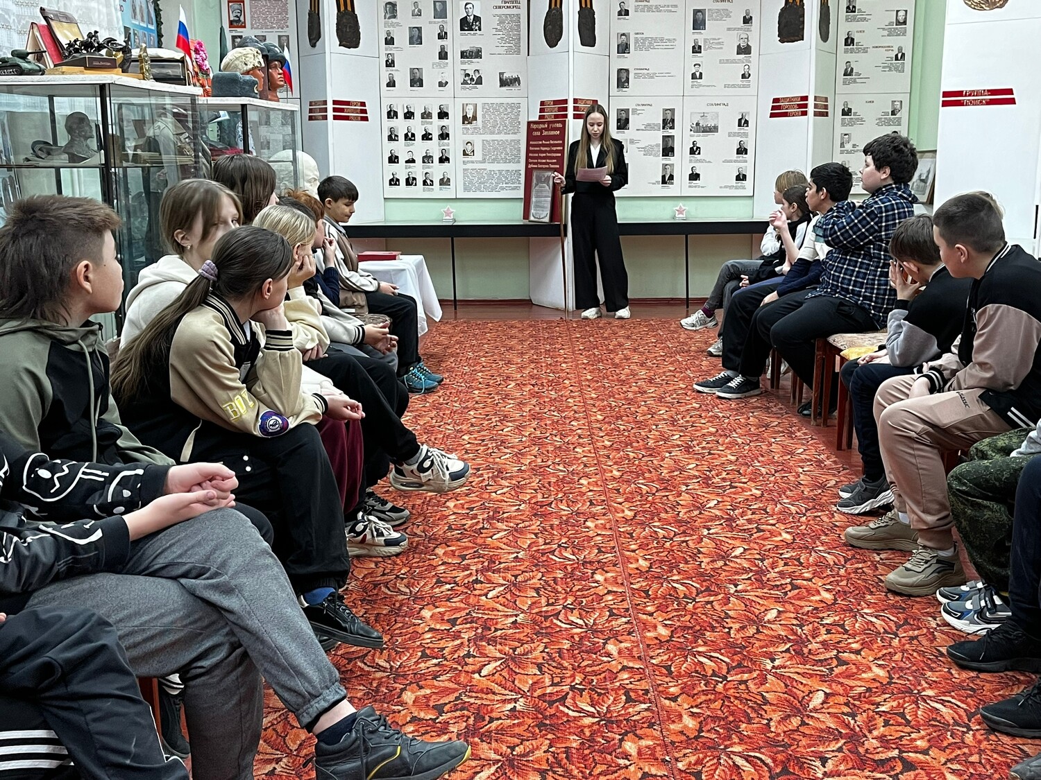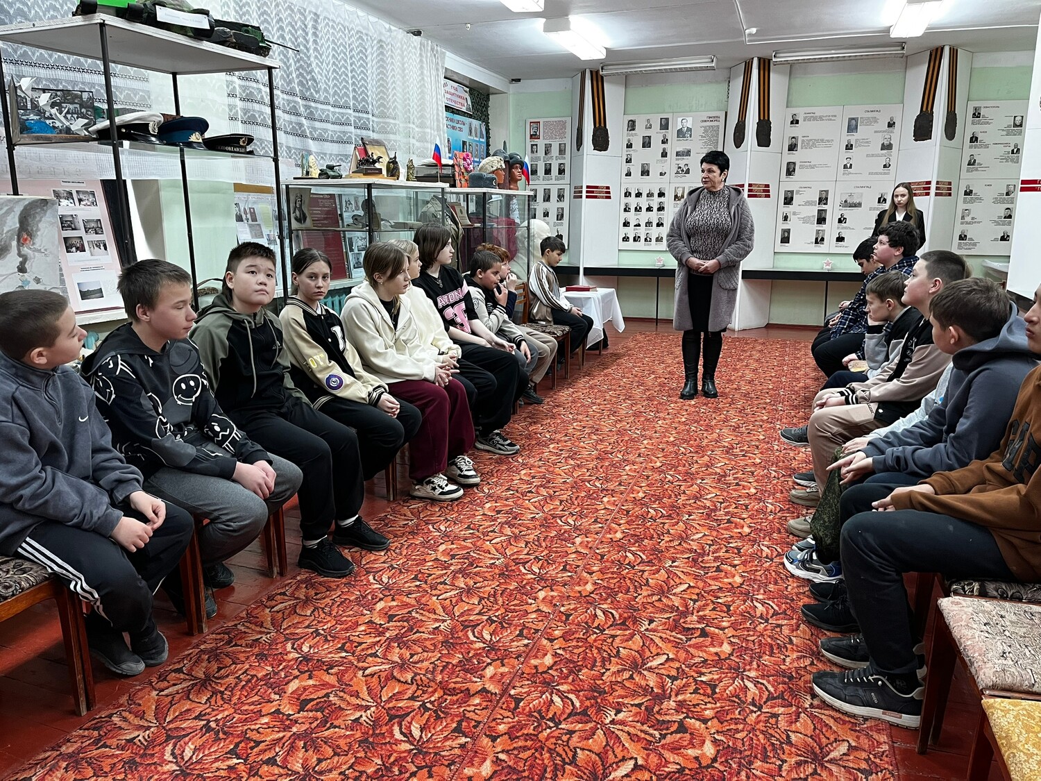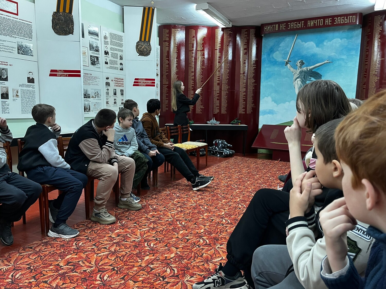 6 февраля 2026 года в рамках патриотического месячника  учащиеся 5А класса посетили школьный музей Боевой славы. Экскурсию провела ученица 10 класса Коробова Екатерина, которая рассказала о возникновении и развитии Заплавинского школьного музея.