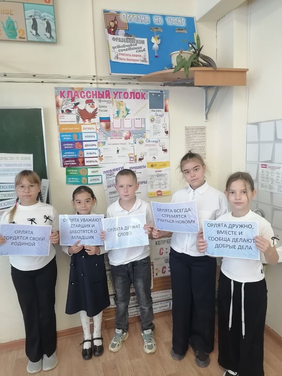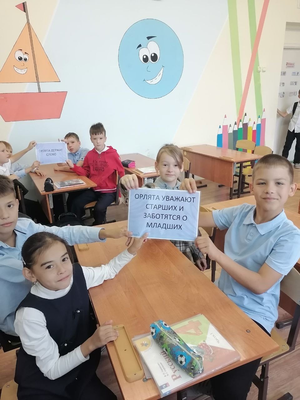 В 4 б классе прошло внеурочное занятие "Орлята России". Ребята посмотрели видеоролик о треках орлят, вспомнили свои занятия за прошлый год, наметили планы на новый учебный год, выбрали лидеров групп. В конце занятия ребята исполнили гимн орлят.