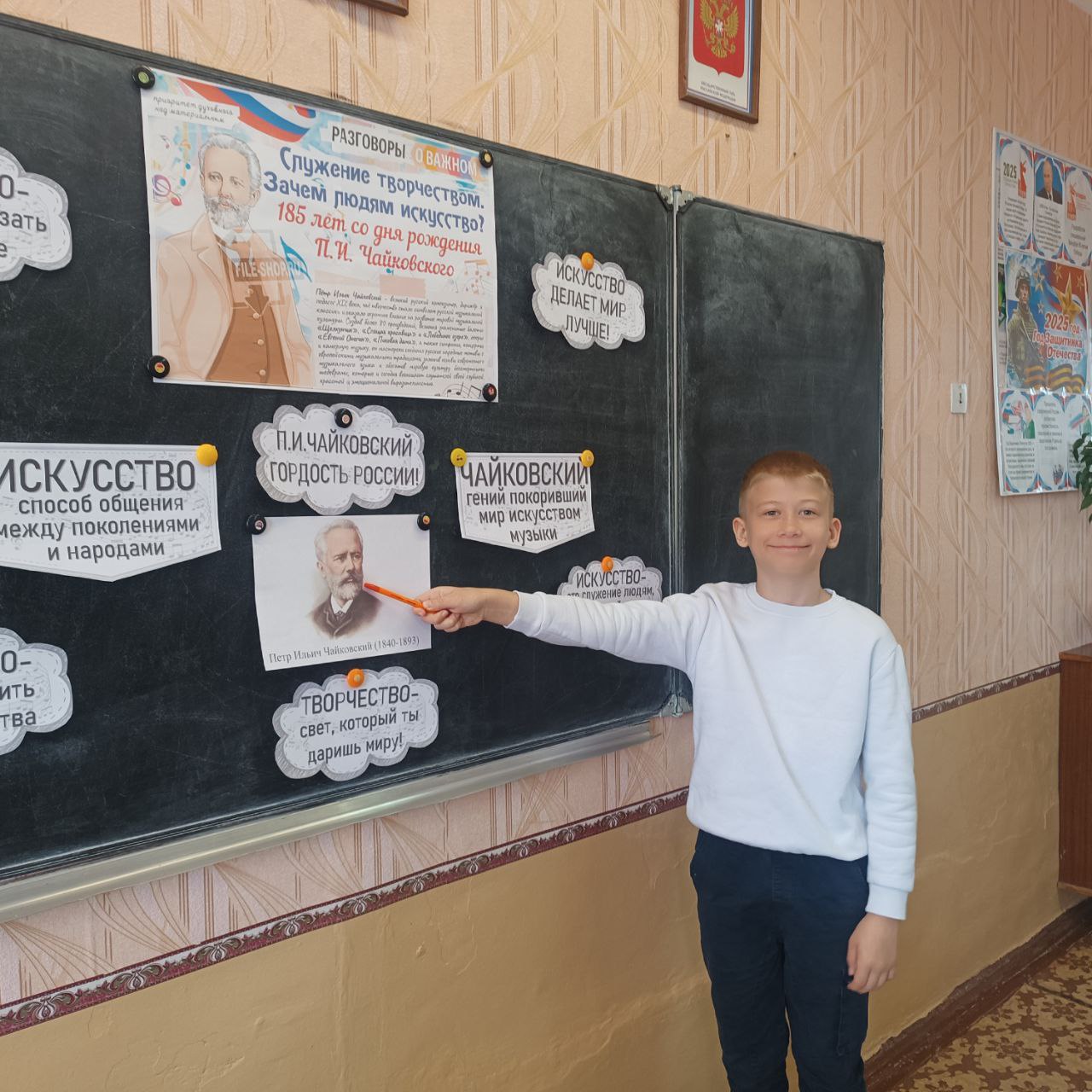 31 марта, в 1-11 классах прошло внеурочное занятие из цикла "Разговоры о важном" на тему: "Служение творчеством. Зачем людям искусство? 185 лет со дня рождения П.И. Чайковского".